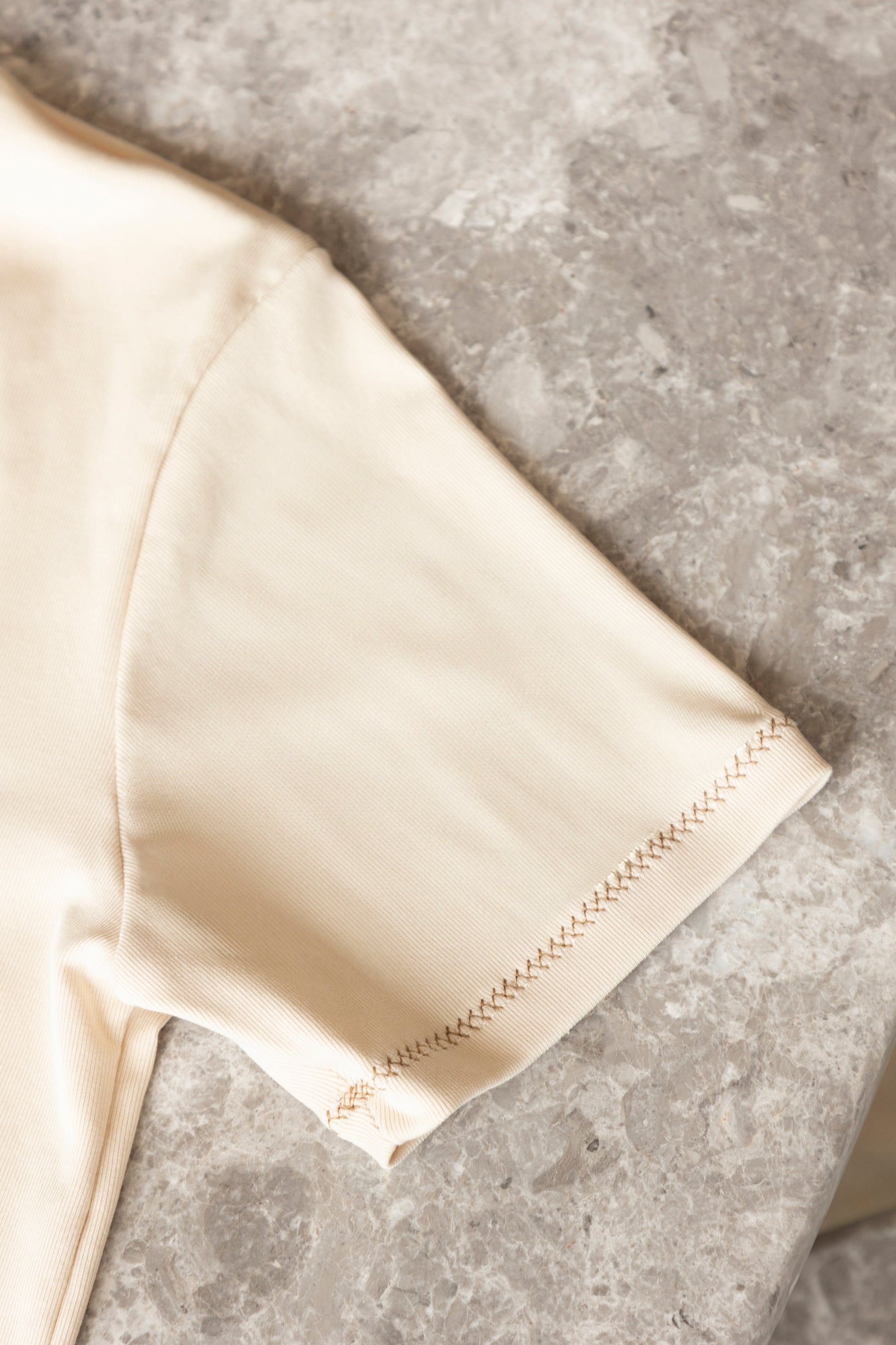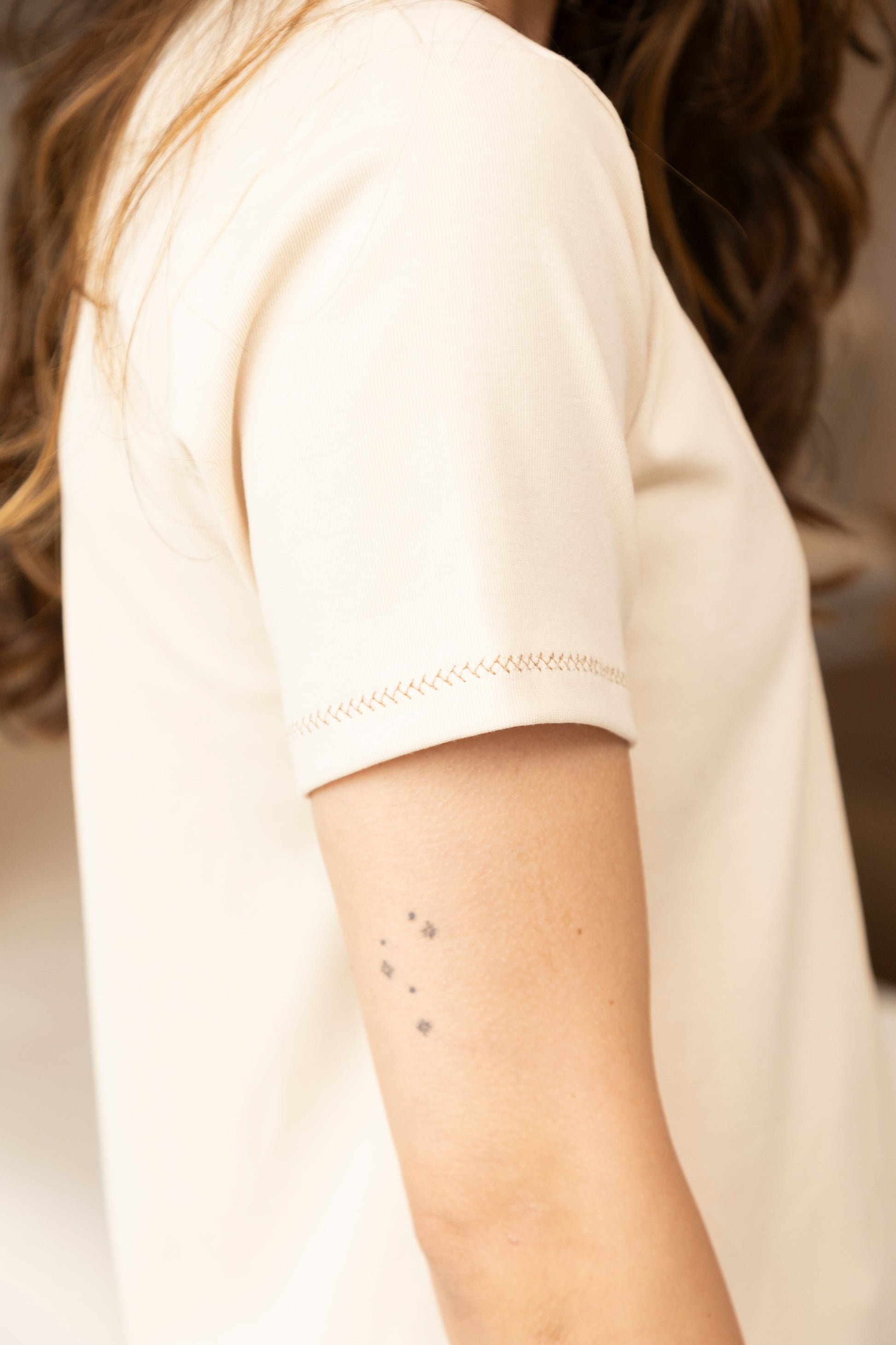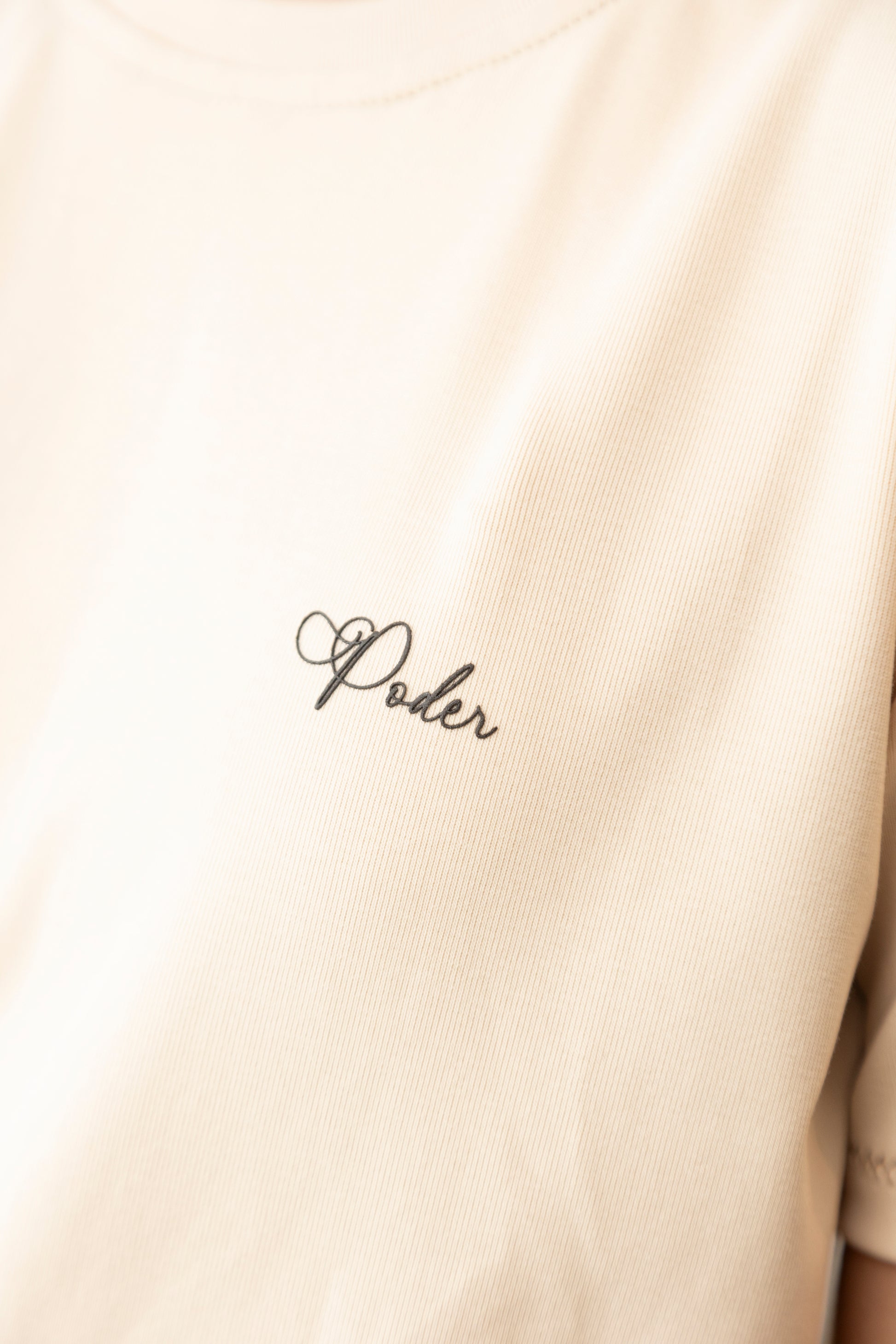 La Power Tee presenta nuestro bordado zigzag característico y la palabra PODER en relieve sobre el corazón, recordando la energía suave pero firme que llevas dentro.